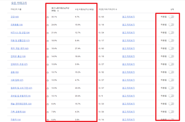지난 30일간 광고노출비중과 노출대비수입비중을 확인해 보시고 광고노출비중과 수입비중이 낮은 카테고리가 있다면 차단하면 클릭률이 높은 광고만 내 블로그에 나오게 하여 CPC와 CTR을 모두 올리는 최적화를 진행할 수 있습니다.