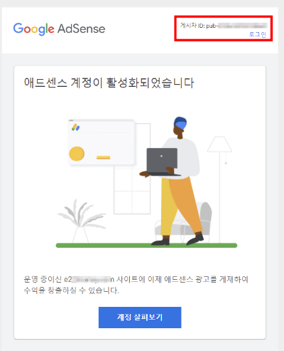 그렇게 승인신청을 하면 신청 시 입력한 구글메일로 애즈센스 계정이 활성화되었습니다.라는 메일이 오면 승인이 된 것이고 광고로 수익을 벌 수 있다. 메일은 보통 새벽시간에 오기 때문에 아침에 확인해 보면 된다. 승인메일을 받고 기쁘다고 캡처해서 단톡방에 공유할 시 필히 조심해 여하는 부분이 있다. 빨간 네모박스 해 둔 곳에 보면 pup코드라고 숫자가 있는데 저 번호는 나의 개인고유번호이므로 절대 노출하면 안 된다.