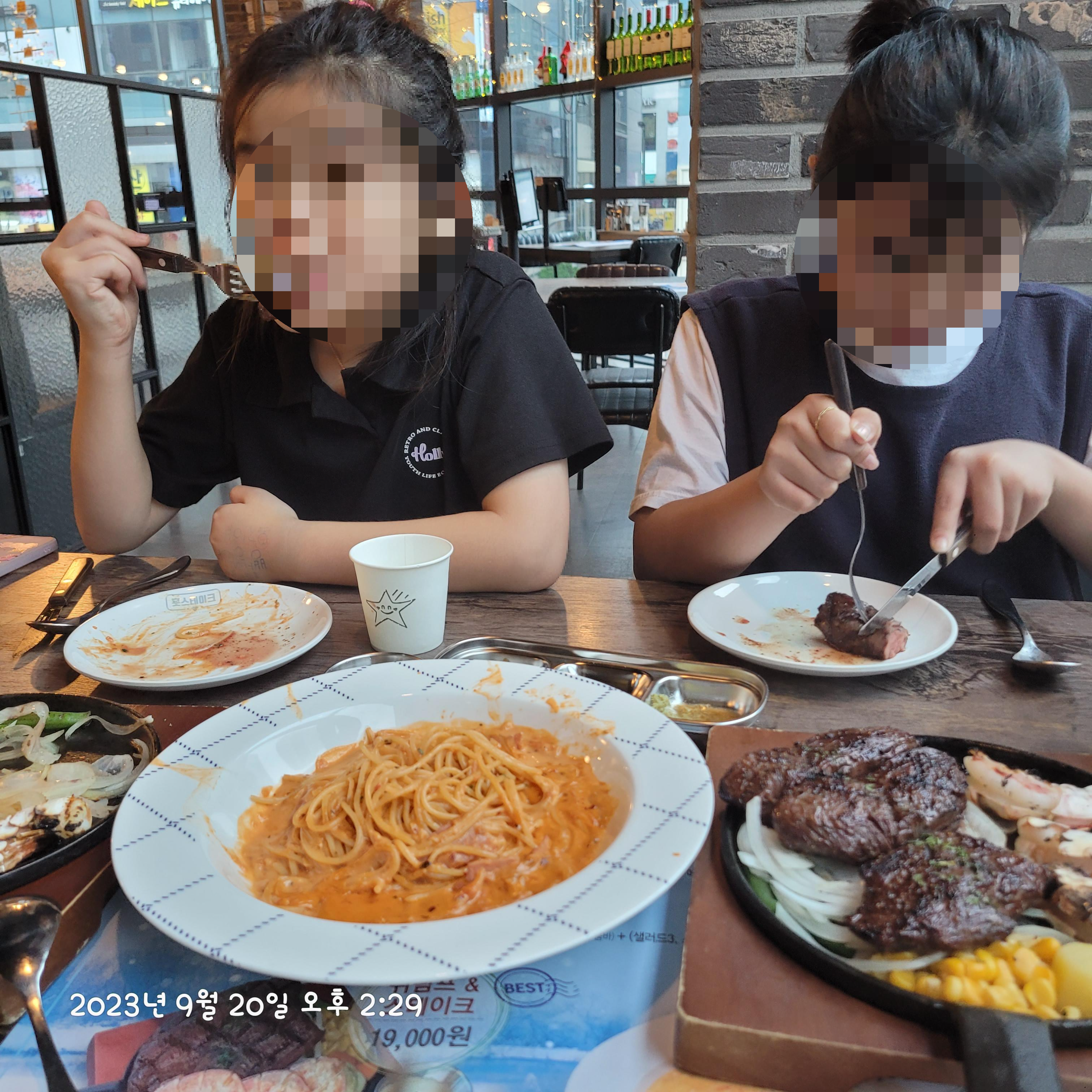 스테이크 한입 로제파스타 한 입 궁합이 참 좋았습니다.
