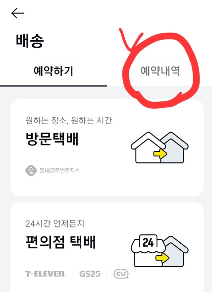 방문택배 예약 신청을 완료하고 나면 예약하기 버튼 옆에 예약내역을 눌러 조회를 할 수 있다.