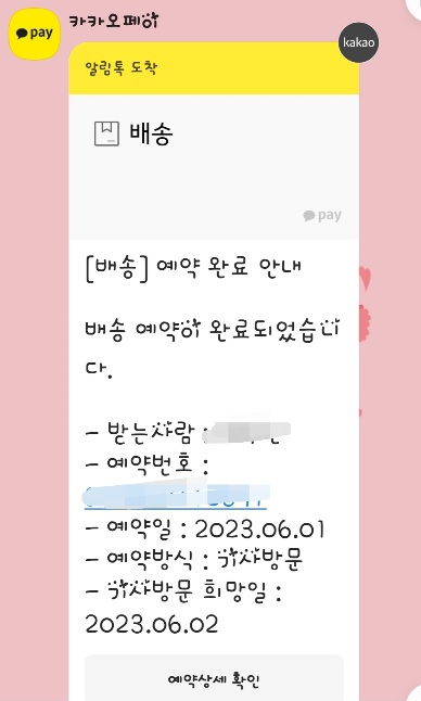 현재 나는 수거를 해 가지 않은 상태라 예약완료라는 메시지만 보이지만 방문택배 신청을 하고 수거한 후부터는 예약 조회를 통해 내 물건의 위치도 실시간으로 조회할 수도 있고 카카오톡 알림으로도 확인할 수 있다.