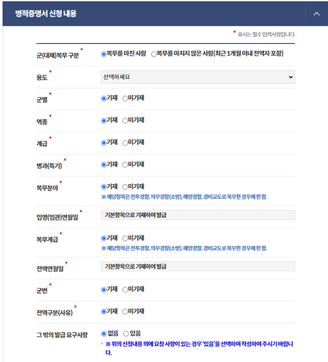 성명, 생년월일, 휴대전화, 군번, 주민등록상 주소, 군 복무구분(복무를 마치 여부), 용도, 계급, 특기, 전역일등 선택하고, 수령방법은 온라인 발급으로 해서 민원신청하기 클릭하시면 됩니다.