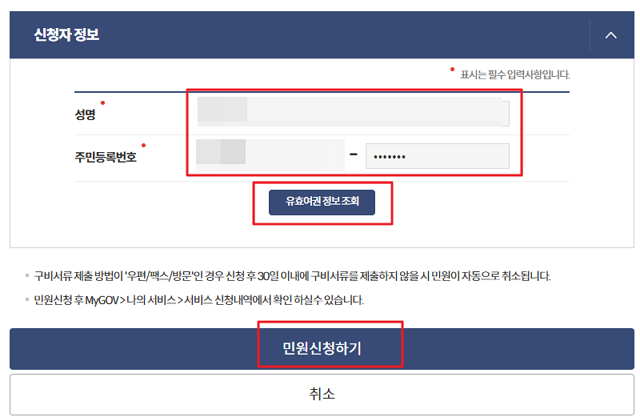 2. 신청자정보를 입려 하고 유효여권정보조회를 누르면 현재 가지고 있는 여권의 정보를 볼 수 있습니다.
