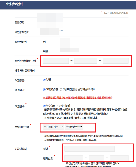 핸드폰번호입력과 여권기간을 선택합니다. 여권기간을 5년으로 하면 기존 초록색으로 재발급되지만 10년을 선택하면 남색의 차세대여권으로 재발급됩니다.