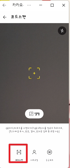 9. 코드스캔 메뉴가 나오면 휴대폰으로 PC화면에 있는 큐알코드를 사진 찍듯 찍어주면 자동 로그인이 됩니다.