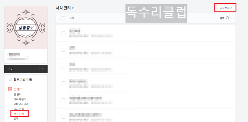 티스토리관리화면-콘텐츠-서식관리-서식 쓰기를 누릅니다.
